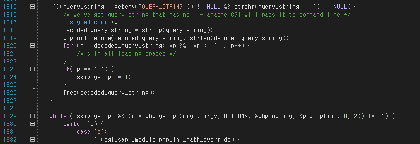 > 1829줄 while(): skip_getopt 변수가 1이므로 while()문을 실행하지 않아 PHP-CGI 옵션 실행 방지